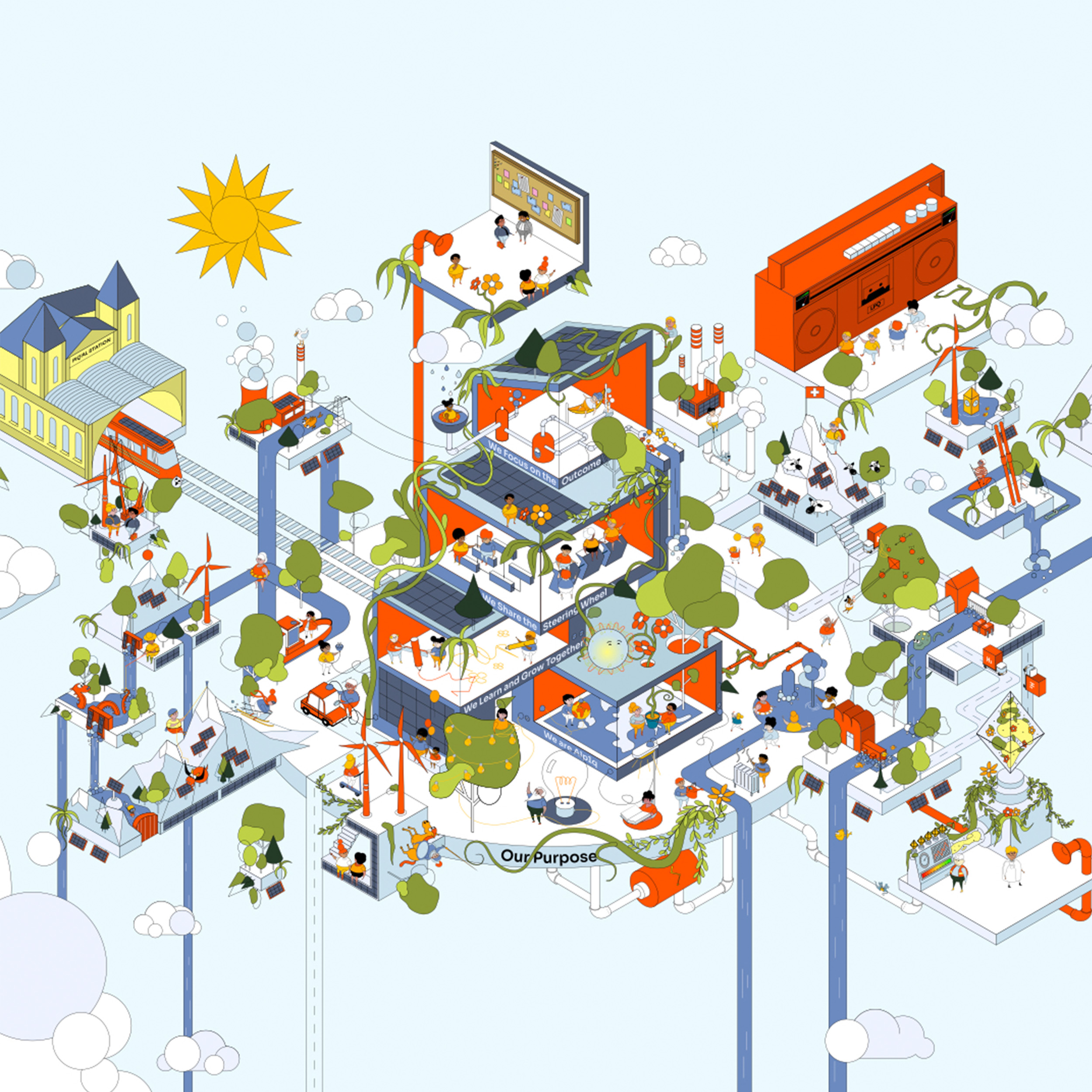 Das Alpiqverse ist ein interaktiver, digitaler Raum, der erstmals eine verbindende Narrative für das Employee Branding schuf. Wiederkehrende Brand Characters wie Dora, der Naturgeist, und Avo, der Hauswart und Sinnbild für Vielfalt, führten durch eine Gamification-getriebene Story. Die Mitarbeitenden wurden selbst zu Avataren und halfen, das Alpiqverse zu retten – nicht mit Strom, sondern mit Teamgeist, Engagement und Diversität.