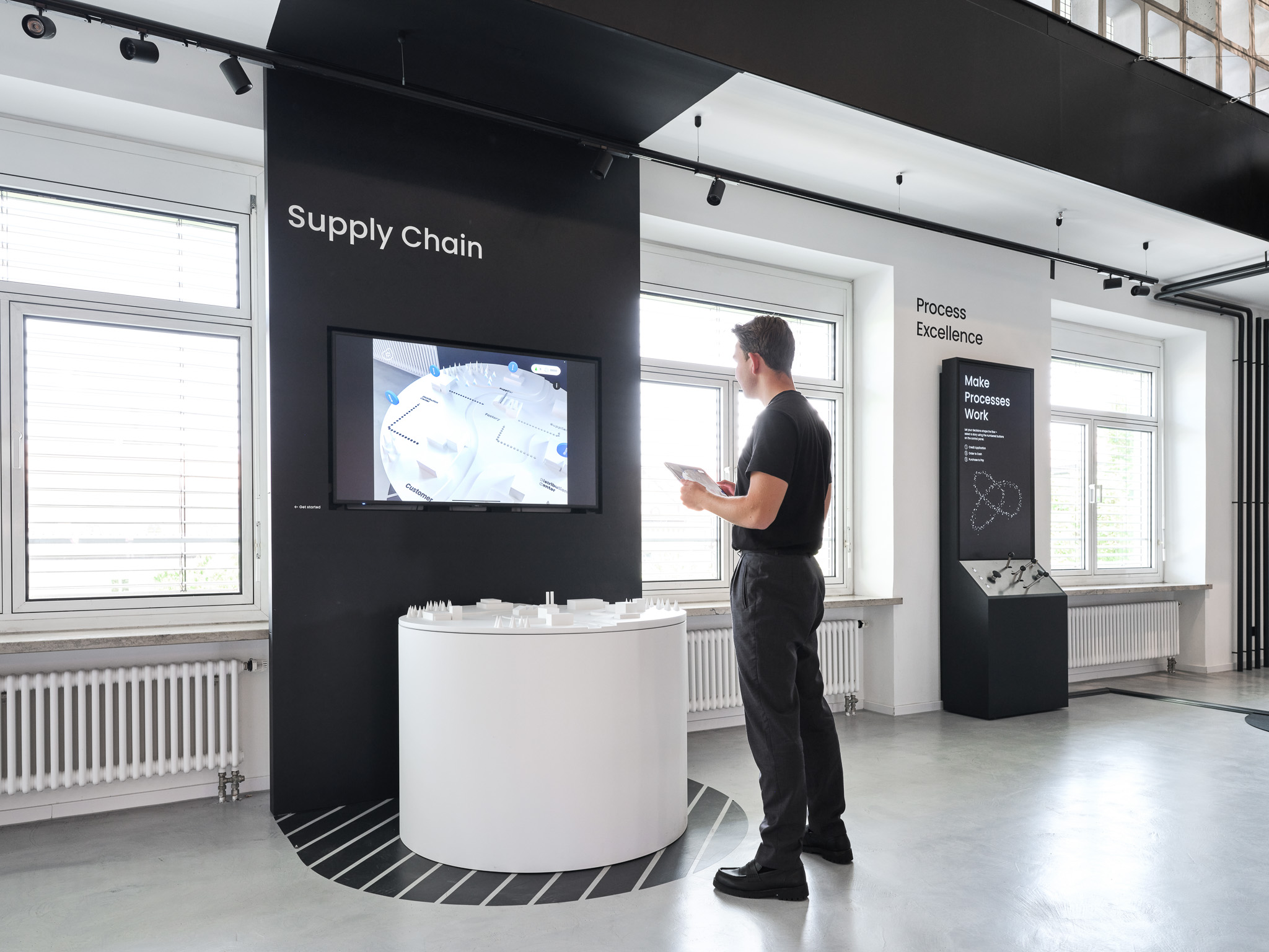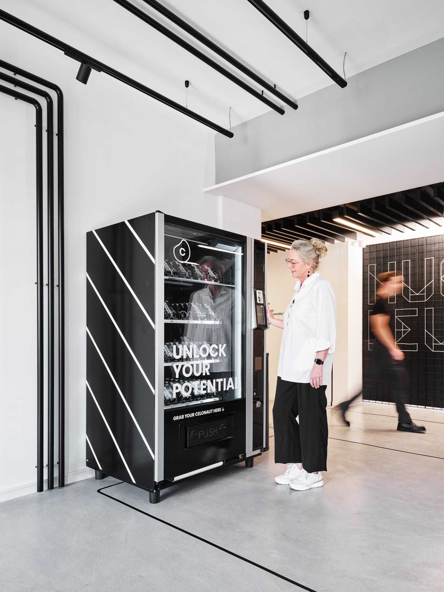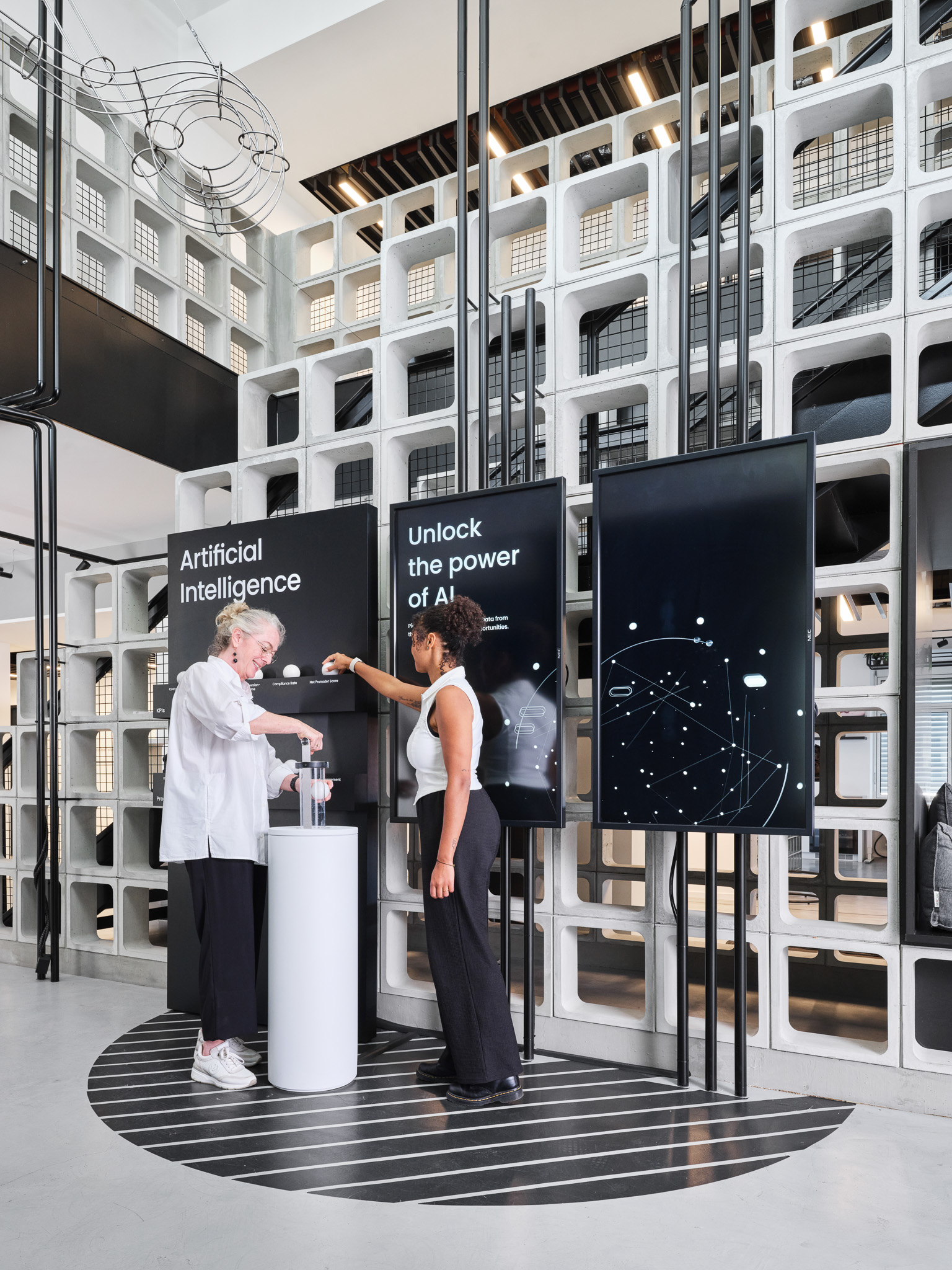 Bereits im Aufzug beginnt die Reise durch den Celonis-Kosmos: Raumgrafiken, Bodentypografien und vier immersive Showcases führen Besucher:innen durch zentrale Themen wie Supply Chain, KI, Process Mining und Virtual Reality. Highlights sind ein 3D-Modell mit AR-Ebene, eine sechs Meter hohe Kugelbahn als kinetische Prozess-Visualisierung und ein KI-Vergleich zwischen generativer AI und Celonis AI. An der Insight Wall wird mitgedacht, am Ende wartet ein personalisierter LEGO-Changemaker.