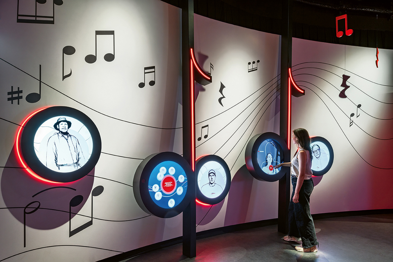 Outside, a 91-meter-long spiral wooden sculpture welcomes visitors: a walkable musical staff featuring Beethoven’s Ode to Joy. It symbolizes optimism, change, and the future, forming the overture to an exhibition where music is not decoration, but the conceptual backbone.