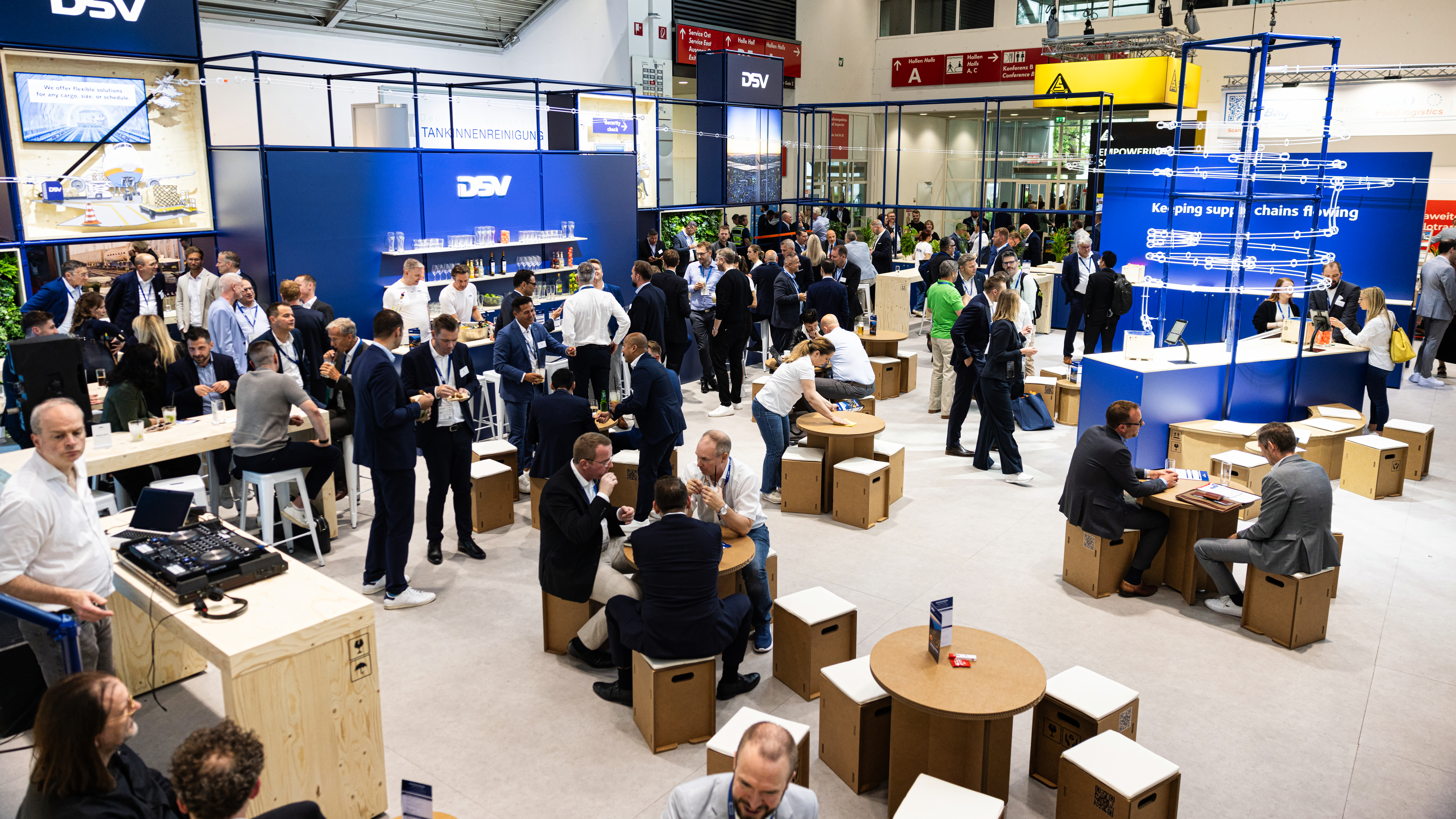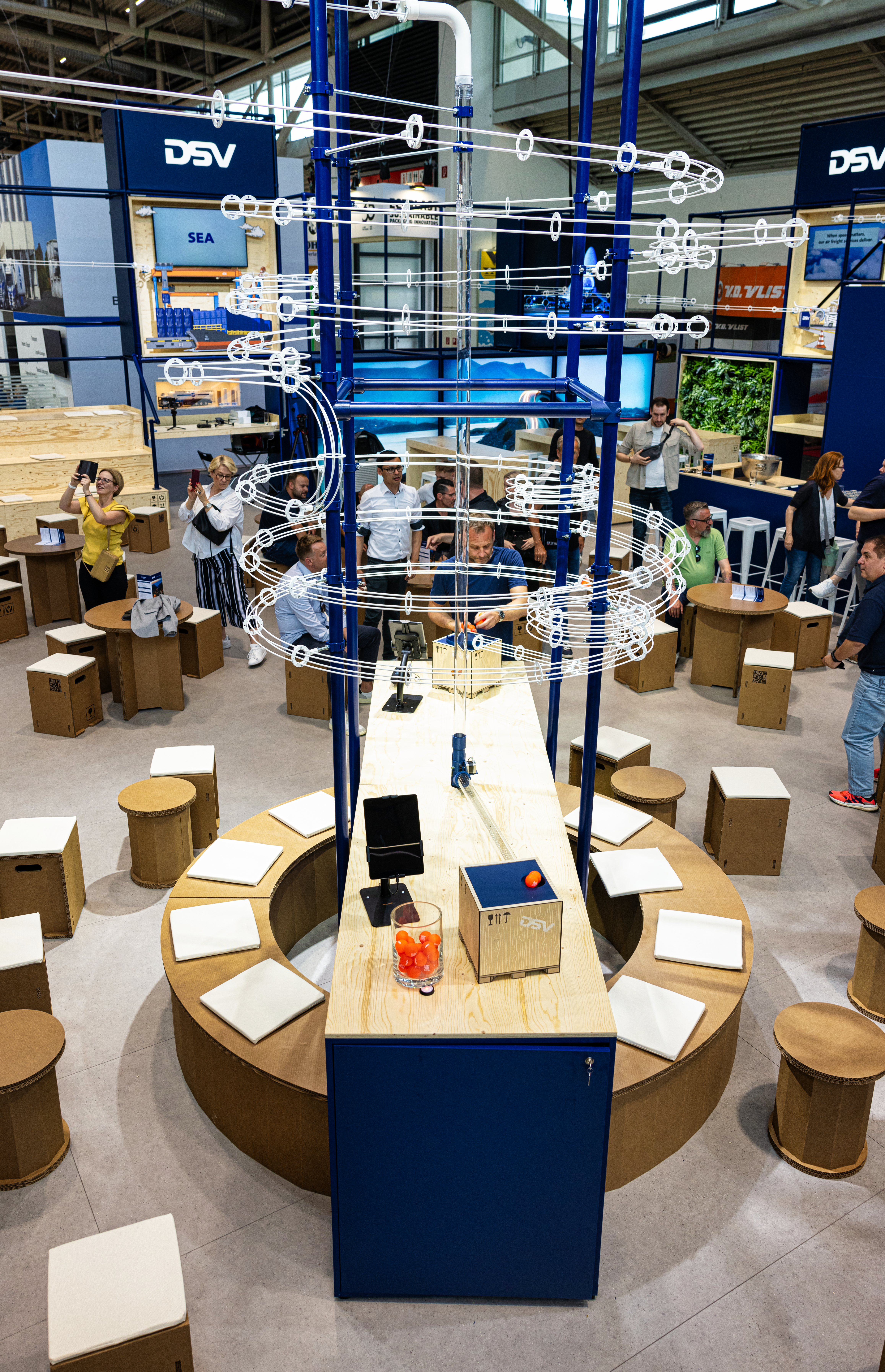 Gestalterisch orientierte sich der Stand am DSV-typischen „blauen Grid“ – eine modulare Gerüst-Architektur, inspiriert von Lagerstrukturen. Stationen aus Seekiefer sowie Möbel aus Pappe erinnerten an typische Logistikmaterialien und schufen eine warme Atmosphäre.