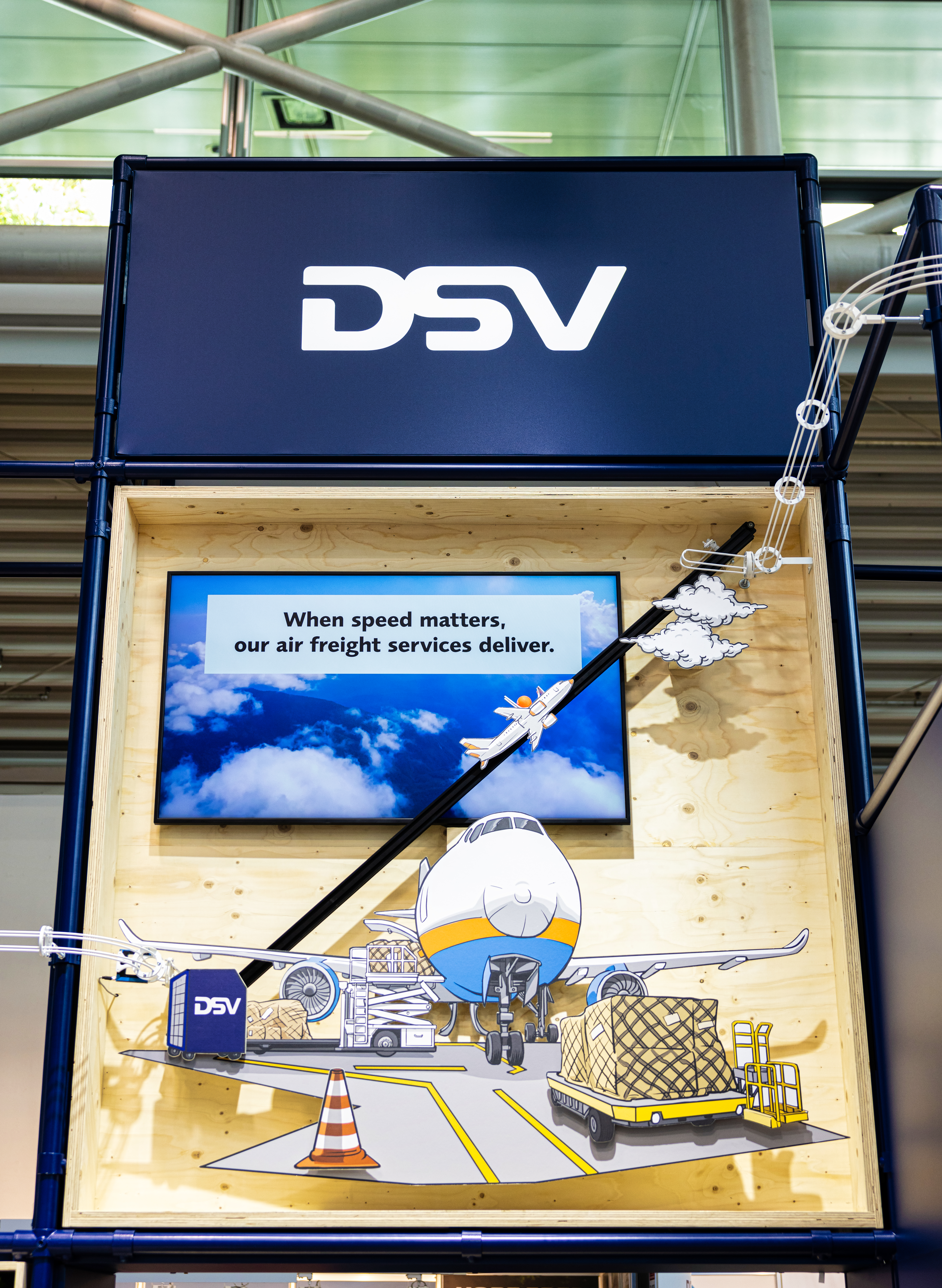 Statt auf große Screens zu setzen, inszenierten wir den DSV-Leitgedanken „Keeping Supply Chains flowing“ als physisch greifbares Erlebnis.