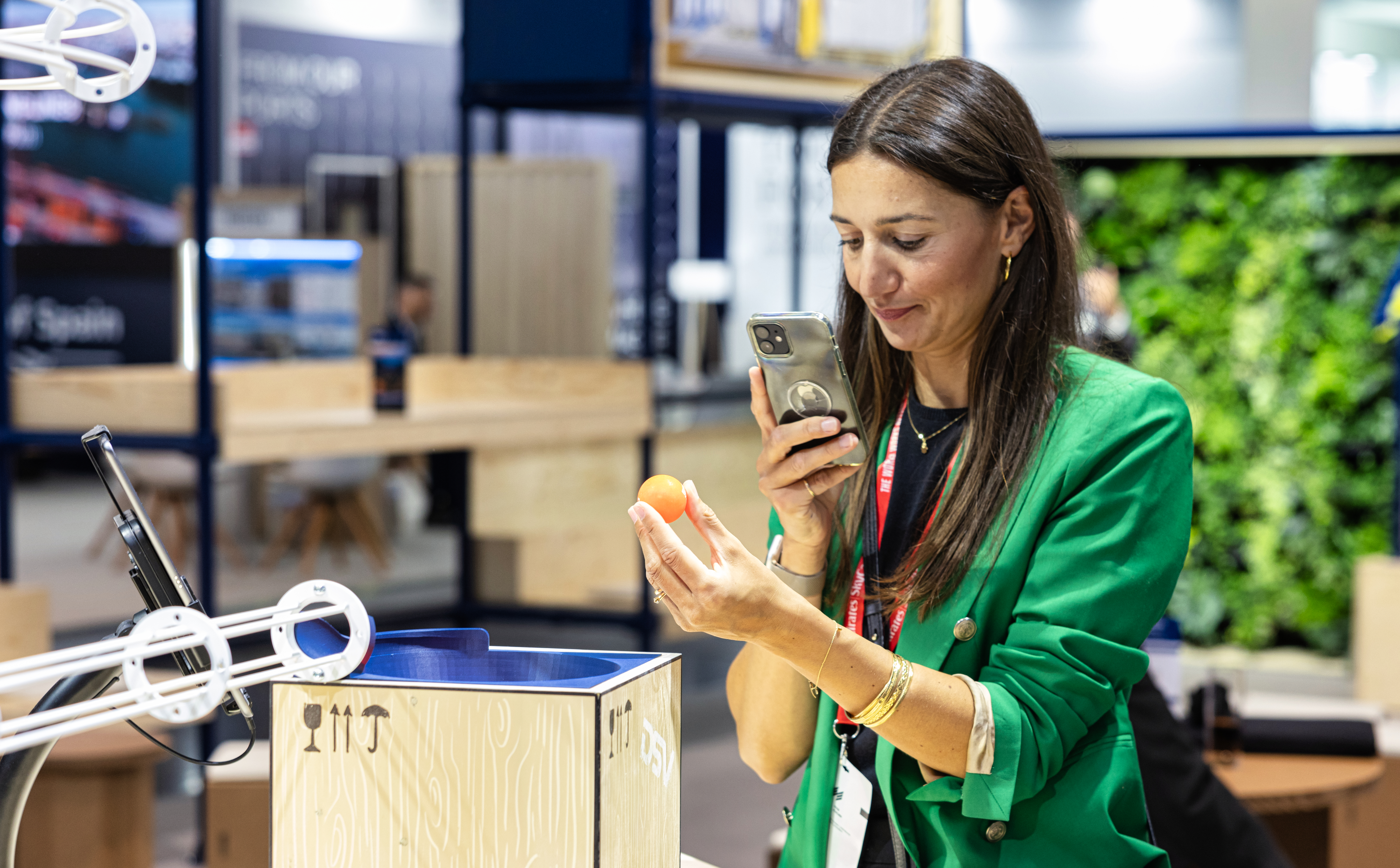 Besucher konnten die Kugel selbst starten. Auf ihrem Weg löste sie – Station für Station –Prozesse und kurze Videos aus, die zentrale Services von DSV verdeutlichten: mal wird sie mechanisch von einem Flugzeug getragen, mal von einem Kran gehoben, mal im Lager gescannt. Am Ziel angekommen, dient sie als Give-Away mit Erinnerung: Der QR Code führt zum Kugelbahn-Video.