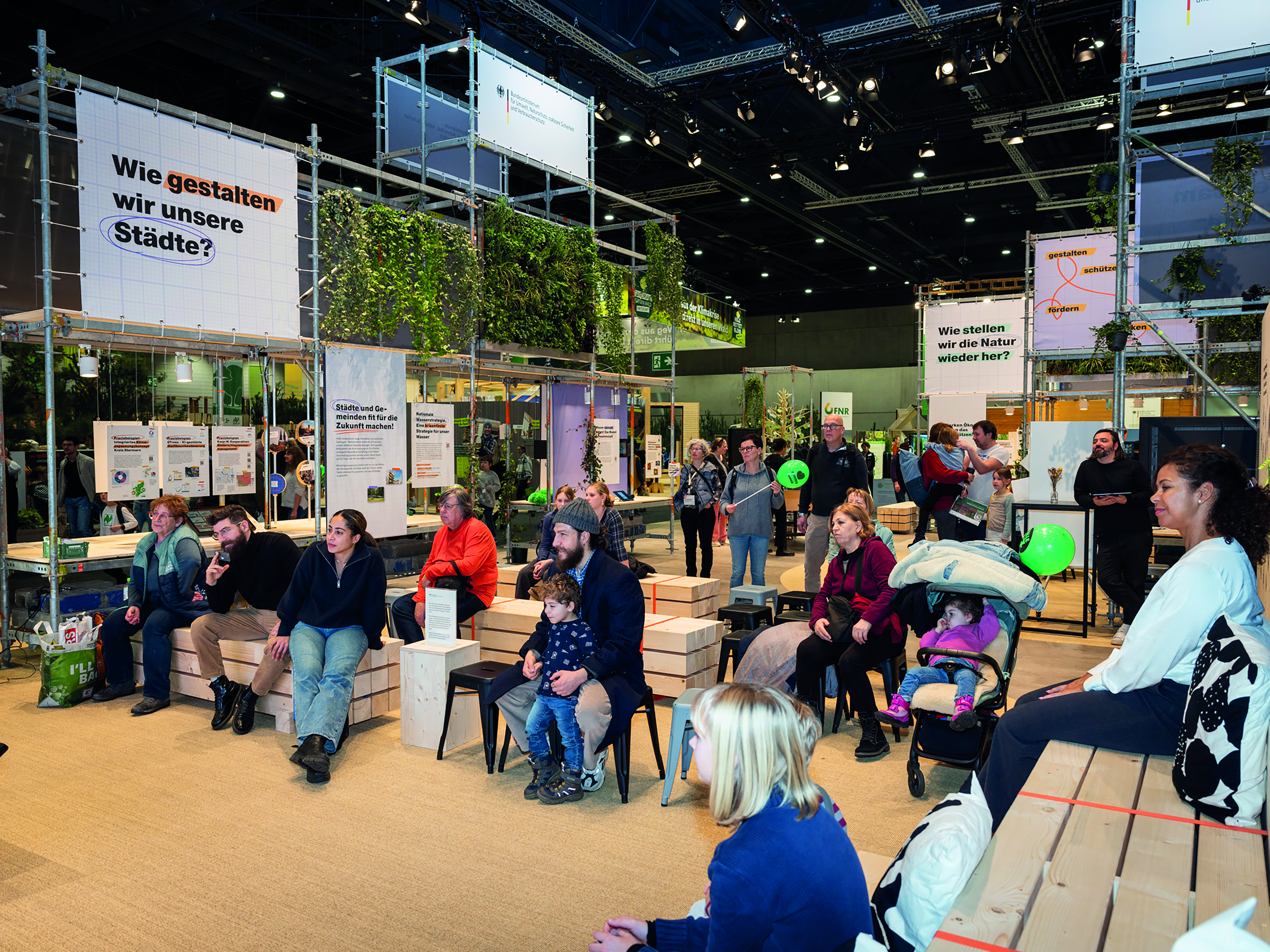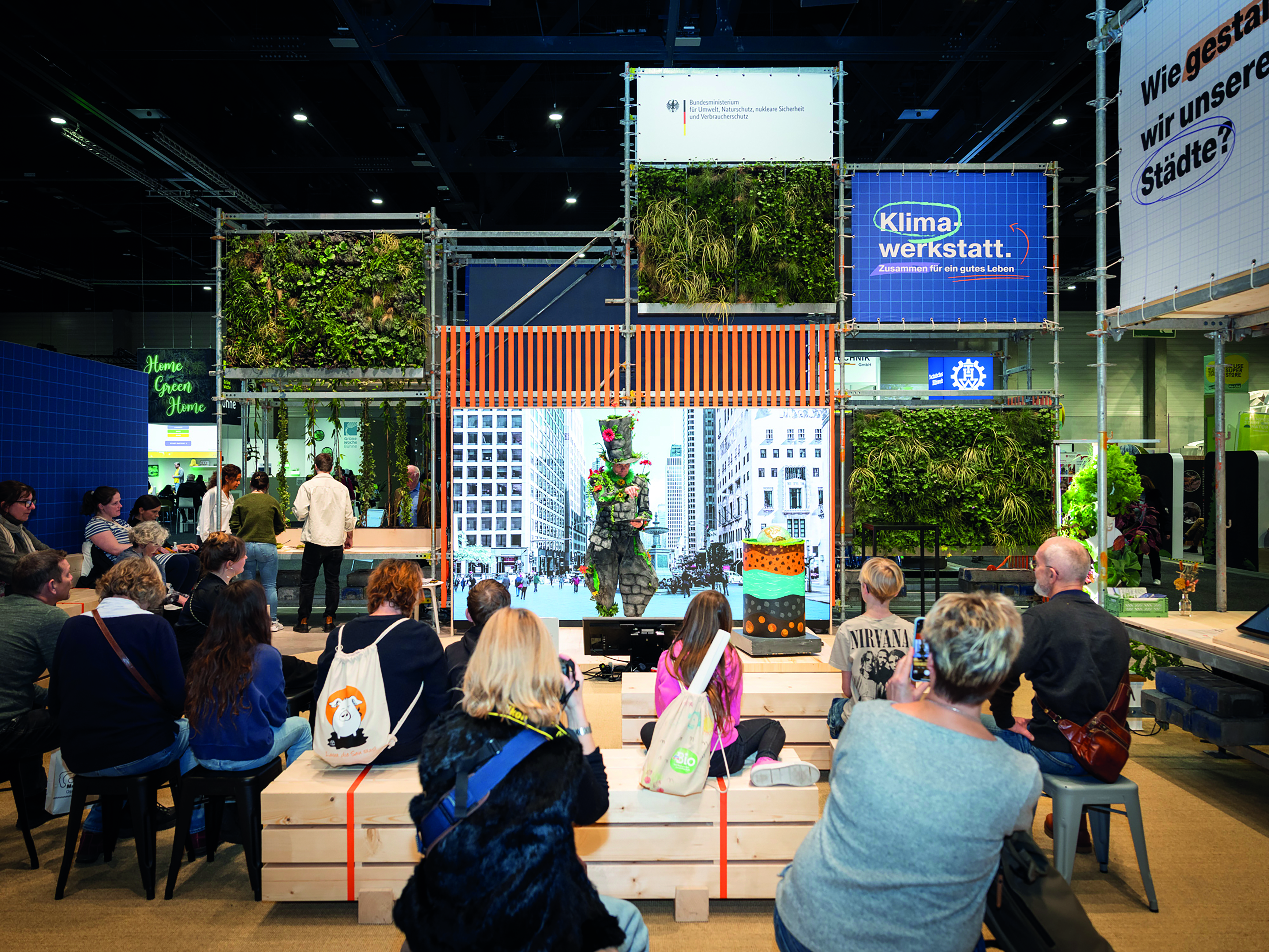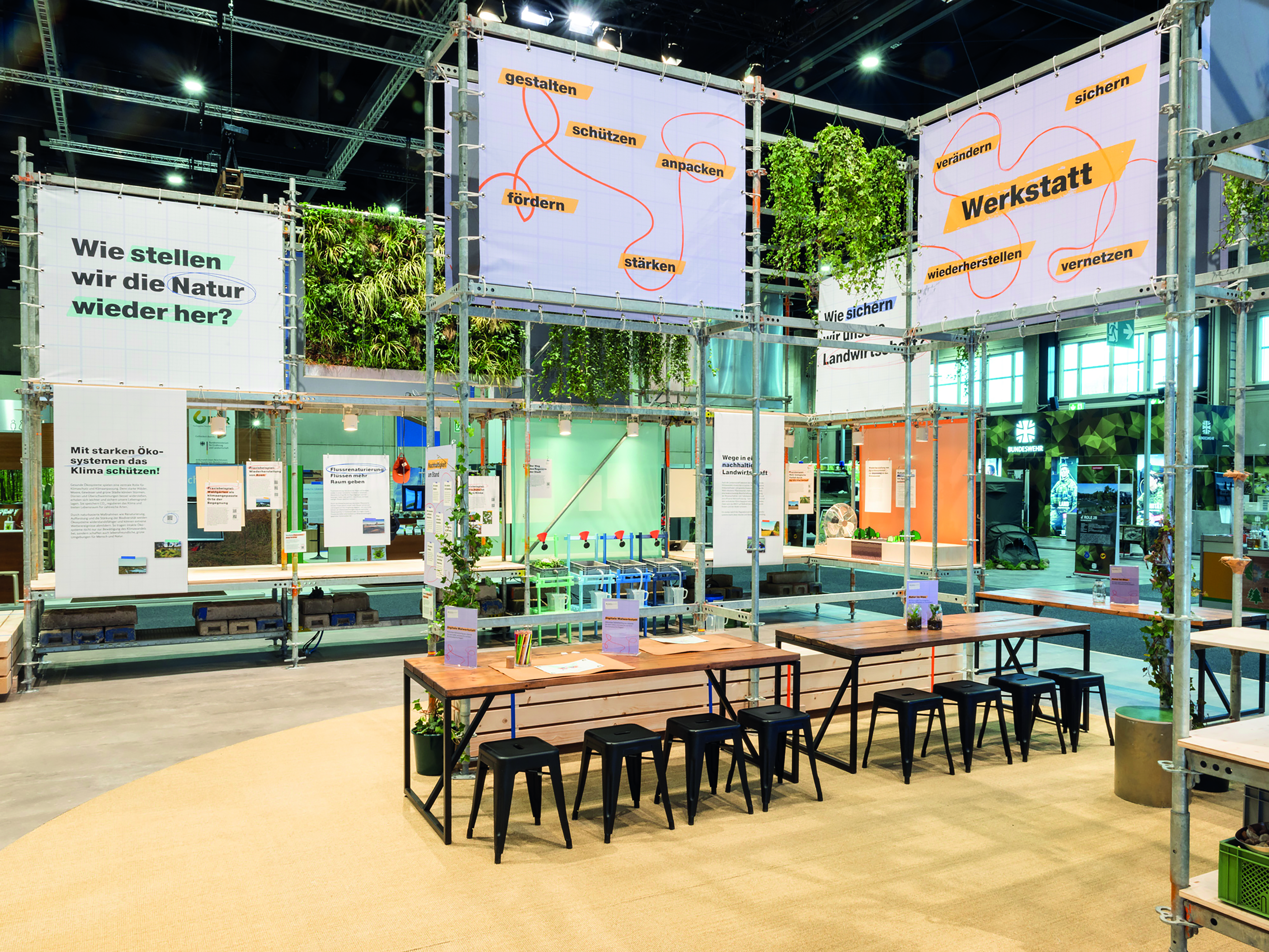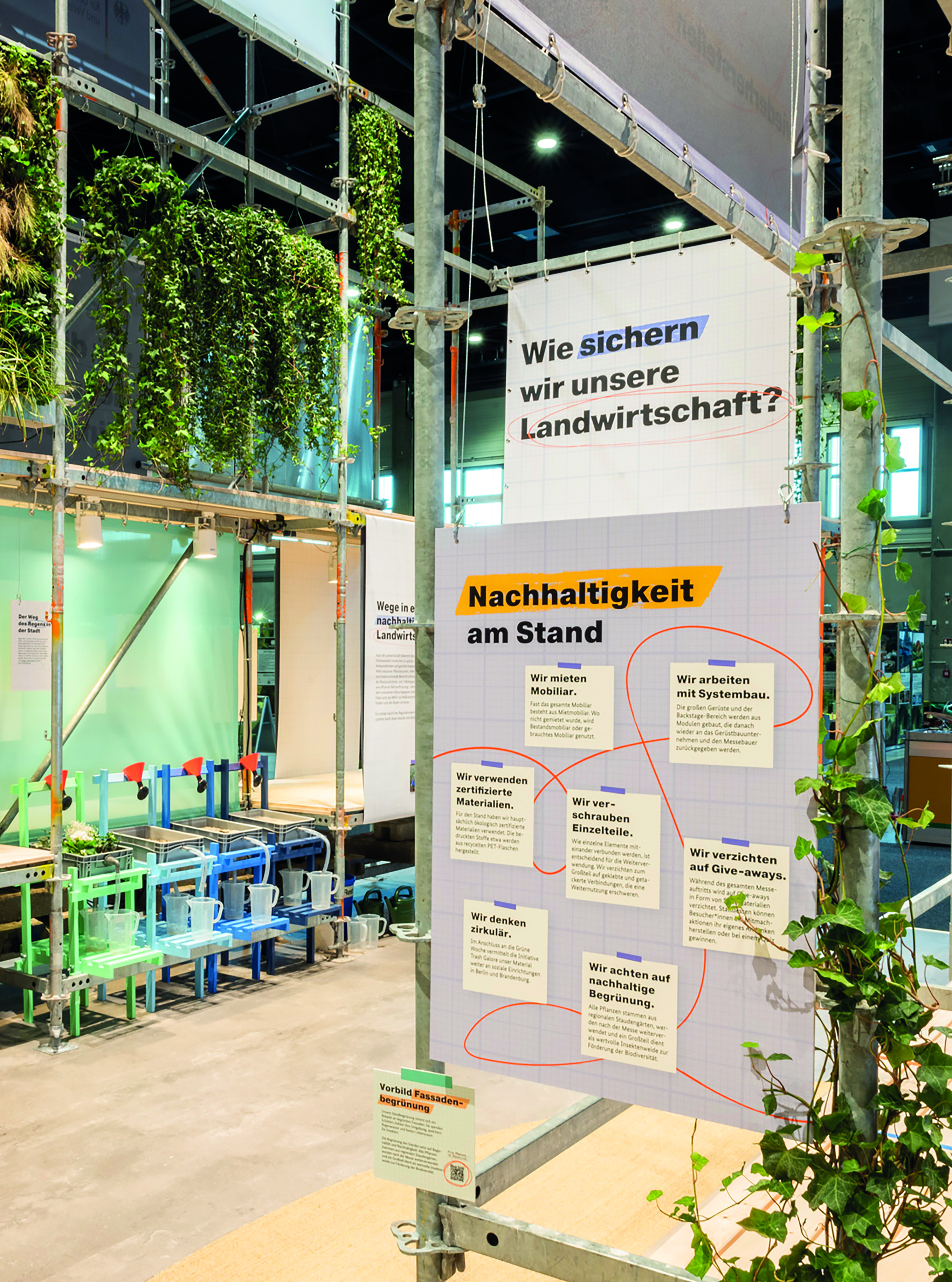 Auch in der Umsetzung wurde Nachhaltigkeit konsequent mitgedacht: Gerüste und Pflanzen wurden gemietet und Materialien nach der Messe an soziale Projekte in Berlin und Brandenburg weitervermittelt. Über zwei Tonnen Material konnten so vor der Entsorgung bewahrt werden.