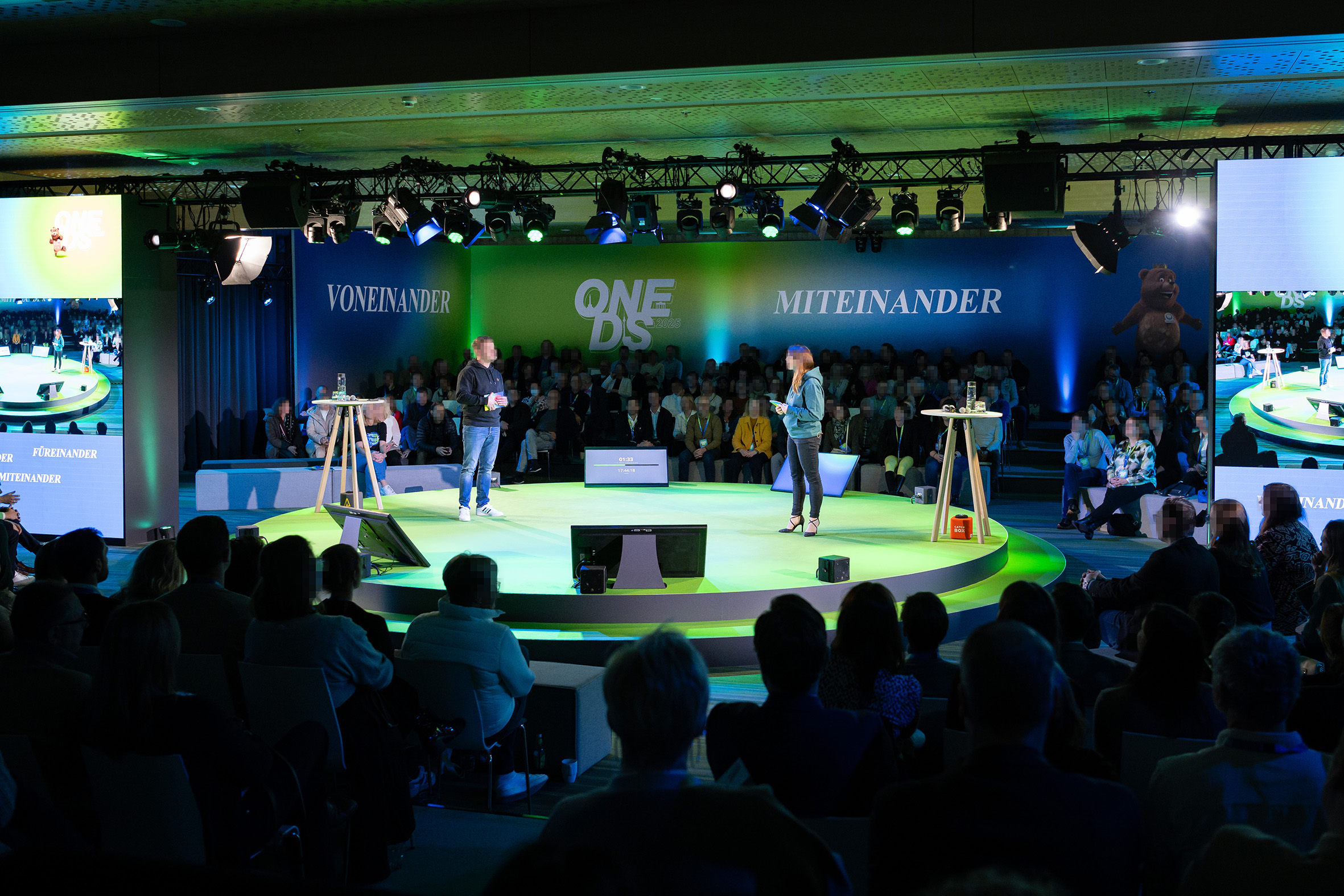 Diese Aspekte betreffen im Kern die Kultur eines Unternehmens. Bei dem Event „One DS-Tagung 2025“ der Firma Daiichi-Sankyo handelt es sich um eine Full Service-Umsetzung für über 450 Teilnehmende: Mitarbeitende aus zwei unterschiedlichen Business-Units der Firma Daiichi-Sankyo, die operativ in getrennten Units tätig sind, wurden vom 14.1.-16.1.2025 zu einer Jahresauftaktveranstaltung nach Berlin eingeladen. Der „One-Culture“-Gedanke stand dabei im Mittelpunkt: „Voneinander, Miteinander, Füreinander“, hieß das ausgegebene Motto. Die KollegInnen der beiden Units sollten sich in Berlin besser kennenlernen und gemeinsam voneinander lernen. Ziel war es, dass sich die Teilnehmenden und divergierenden Stakeholder als eine Gemeinschaft begriffen, die die Unternehmensvision verstand und Impulse für die zukünftige Zusammenarbeit und für bevorstehende Projekte gewann.